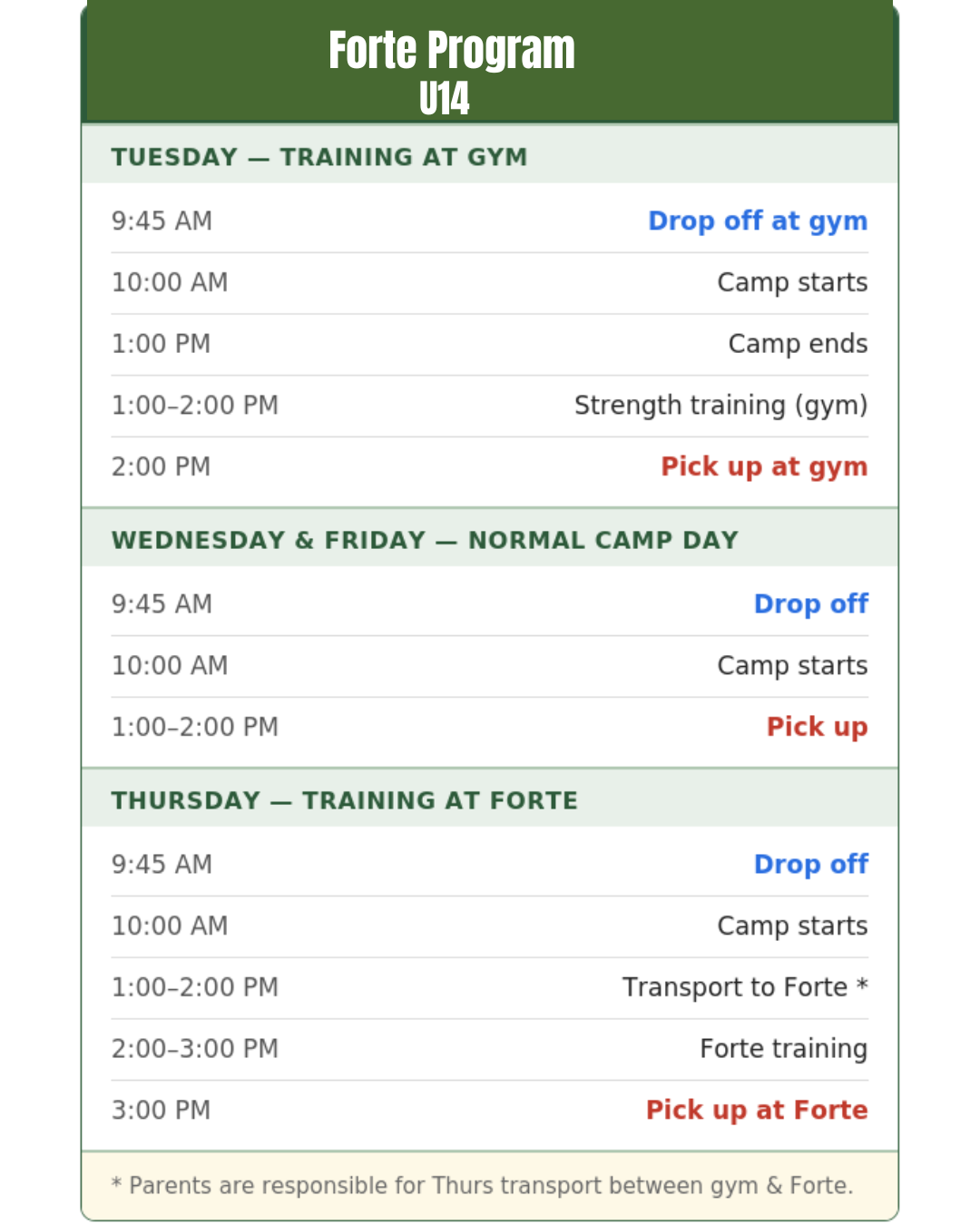 Forte Program — On + Off Court Everything in the On-Court program, plus dedicated strength and conditioning sessions at the Forte facility. Built for athletes who want the full-athlete edge — developing their body and their game at the same time. The Forte Program runs on a structured weekly schedule with specific training days built in.